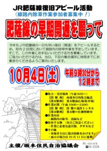 2021年から毎年、肥薩線早期復旧を願って開催されている、坂本町区間の除草作業。 今年は、10月4日(土)に、開催されます! 八代市内。8月11日の水害からの復旧作業がまだまだ続いていますが、坂本町は、水害から5年経った […]